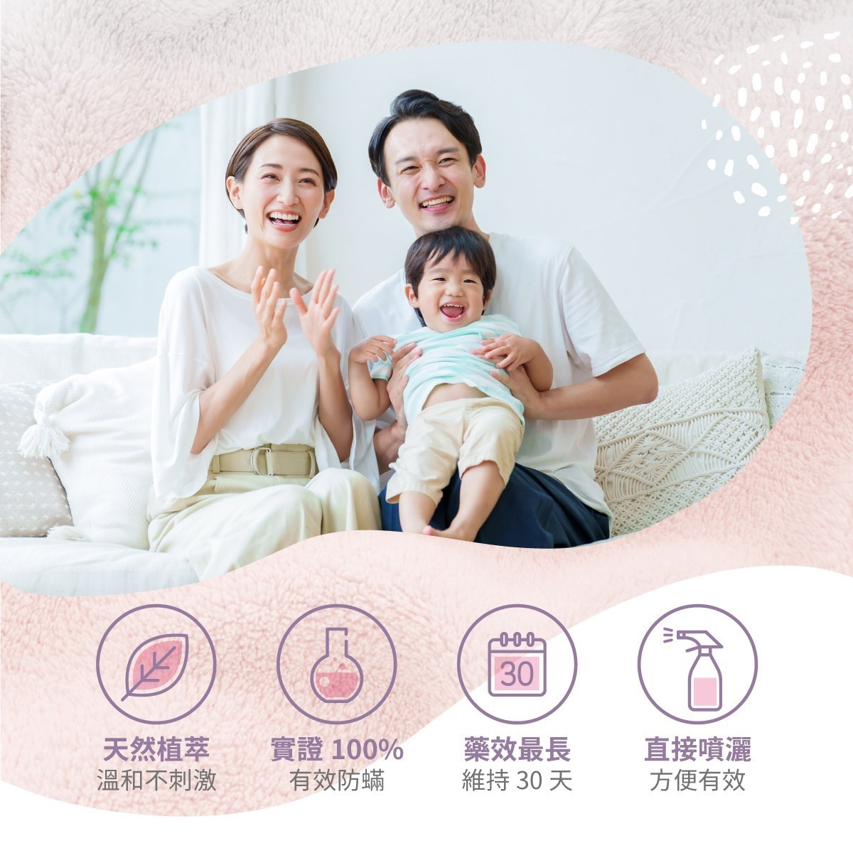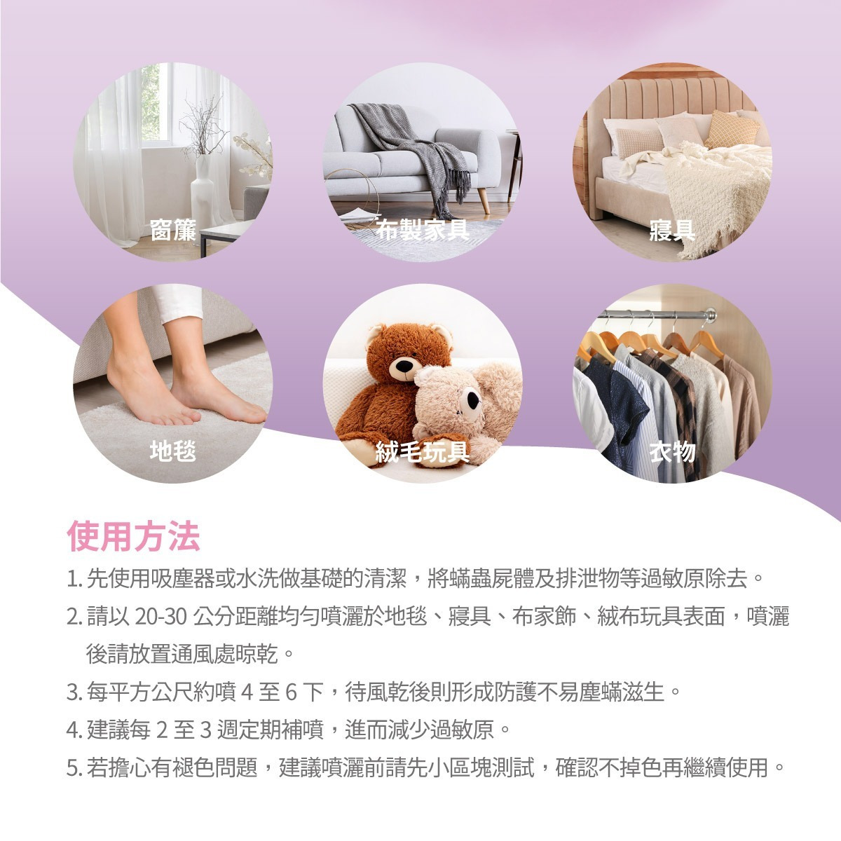 1.請以20~30公分距離均勻噴灑於地毯、寢具、布家飾、絨布玩具表面,噴灑後請放置通風處晾乾。