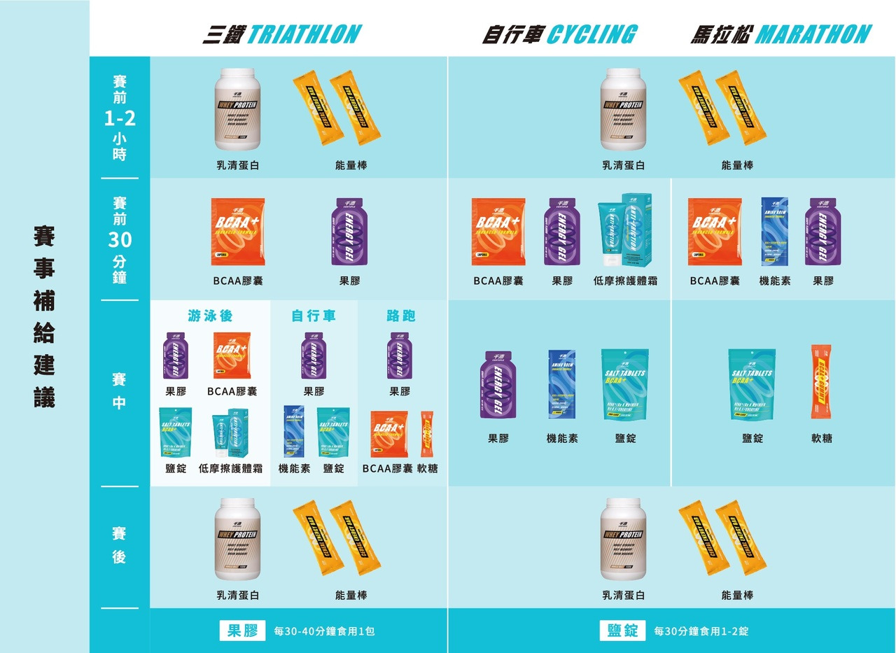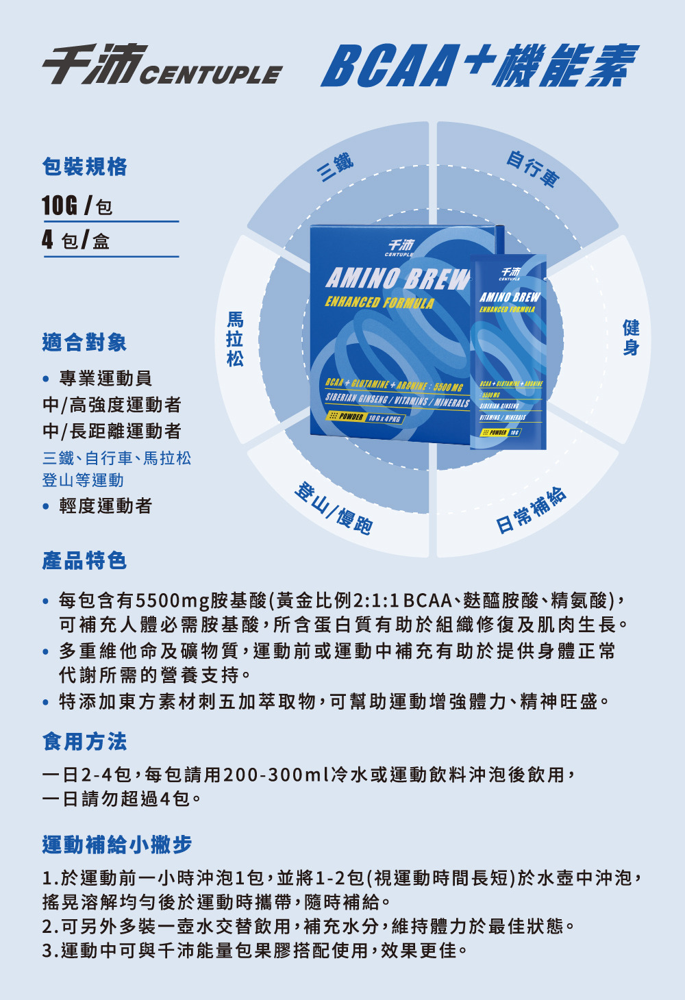 成分:速溶支鏈胺基酸2:1:1(L-白胺酸、L-異白胺酸酸、L-α胺基異戊酸、葵花卵磷脂)、葡萄糖、L-麩醯胺酸、綜合維生素礦物質(麥芽糊精、磷酸鈣、碳酸鈣、焦磷酸鐵、氧化鎂、葡萄糖酸鋅、維生素C、酵母鉻、葡萄糖酸錳、維生素E、菸鹼醯胺、葡萄糖酸銅、維生素A醋酸鹽、本多酸鈣、維生素B12、酵母硒、維生素B1、維生素D3、核黃素、維生素B6、葉酸、碘化鉀、生物素)、麥芽糊精、L-精胺酸、蘋果酸、檸檬酸、L-肉酸、香料、刺五加萃取物、醋磺內酯鉀(甜味劑)、蔗糖素(甜味劑)、氯化鈉、氯化鉀.