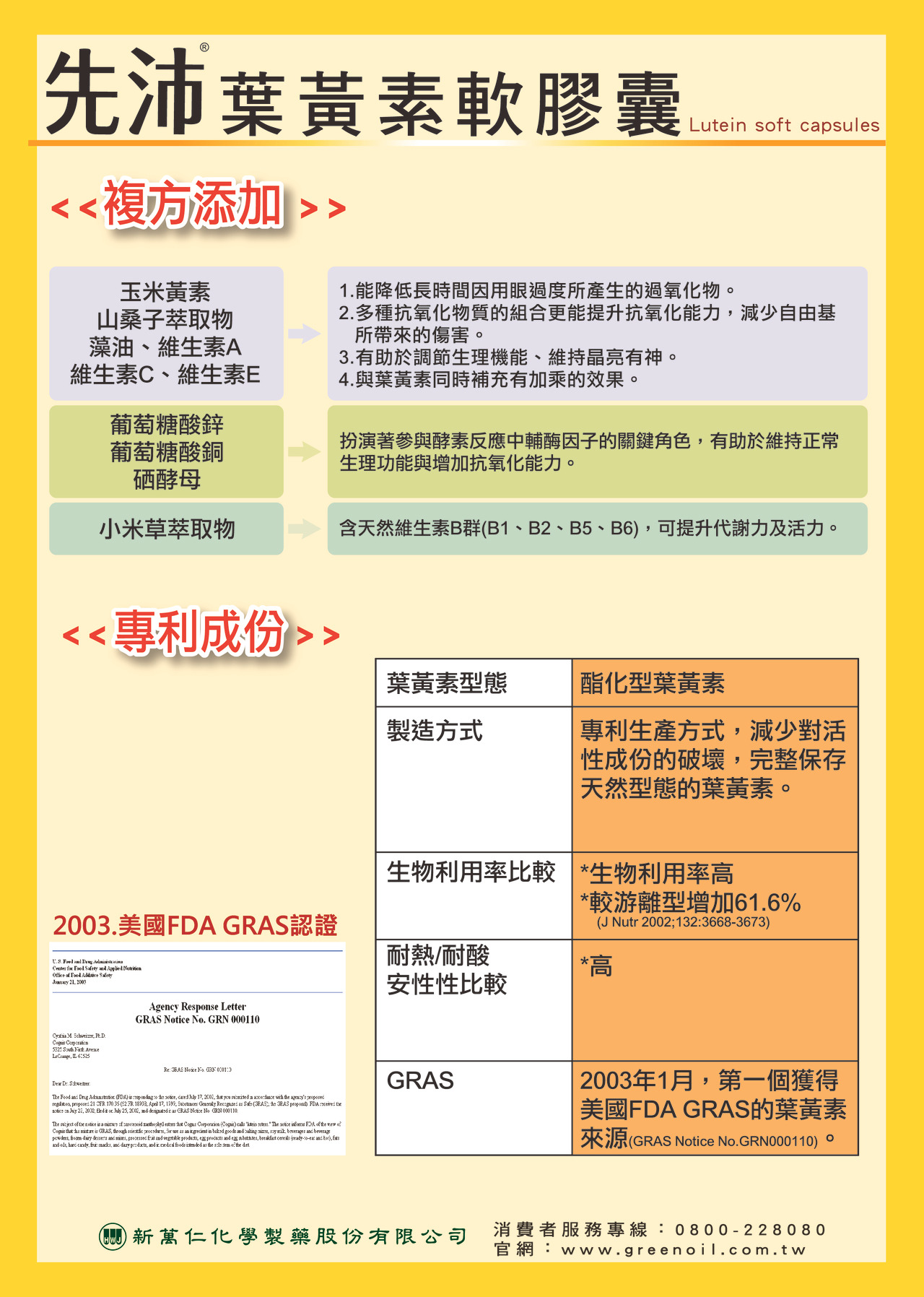 主成分:大豆油、金盞花萃取物(大豆油、混合類胡蘿蔔素酯(金盞花萃取來源)、L-抗壞血酸棕櫚酸酯(抗氧化劑)、混合濃縮生育醇(抗氧化劑))、維生素C、金盞花萃取物(葵花油、金盞花萃取物)、葡萄糖酸鋅、大豆卵磷脂、脂肪酸甘油酯、維生素E(乙酸DL-α-生育醇酯)、DHA藻油(DHA藻油、葵花油、迷迭香萃取物、混合濃縮生育醇(抗氧化劑)、L-抗壞血酸棕櫚酸酯(抗氧化劑))、山桑子萃取物(山桑子果實、麥芽糊精)、小米草萃取物(小米草萃取、麥芽糊精)、硒酵母、葡萄糖酸銅、維生素B2、維生素B1、維生素A油溶液(維生素A棕櫚酸酯、花生油、維生素E(抗氧化劑)